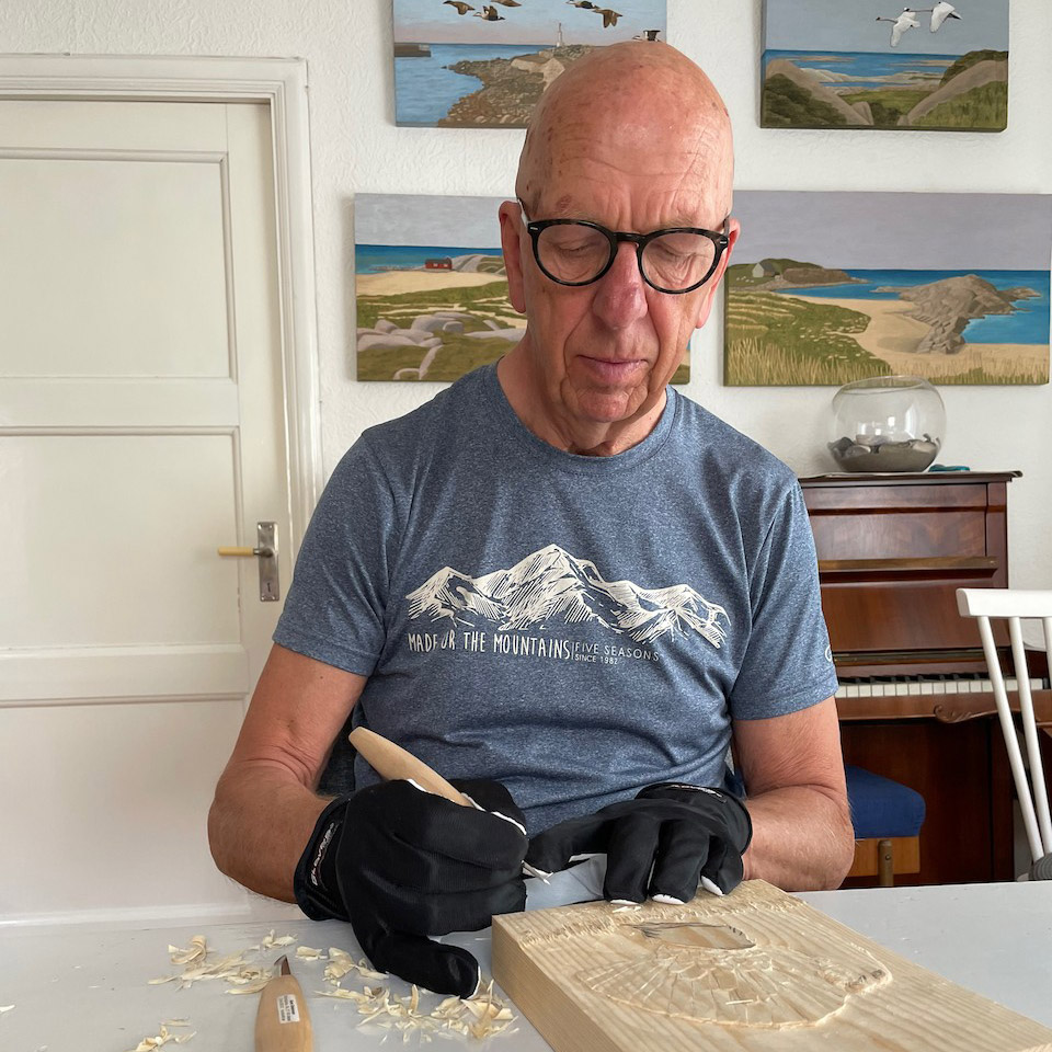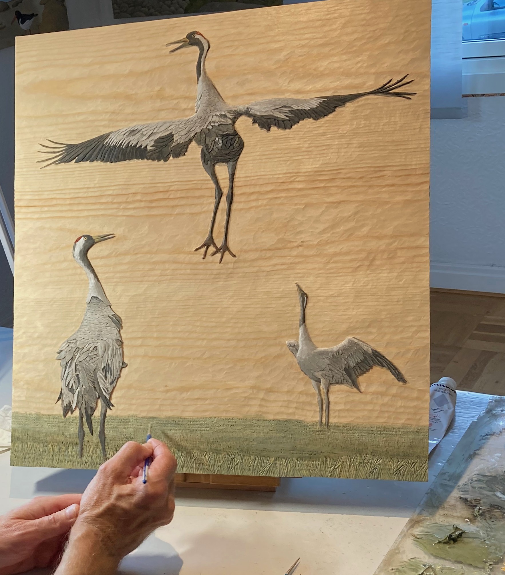 Jag skär ut motivet i ett stycke där jag använder olika verktyg, beroende på hur mycket trä som ska tas bort. När det gäller de riktigt små detaljerna, så som fåglars fjädrar, arbetar jag med mycket små och vassa knivar. Slutligen målar jag reliefen med oljefärger.